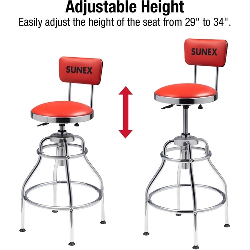 - The Sunex Tools 8516 Hydraulic Shop Stool is built to provide comfortable seating with height adjustability for shop and garage work. Seat height is adjustable from 29-inch to 34-inch, giving users flexibility to match different workbench and vehicle heights.