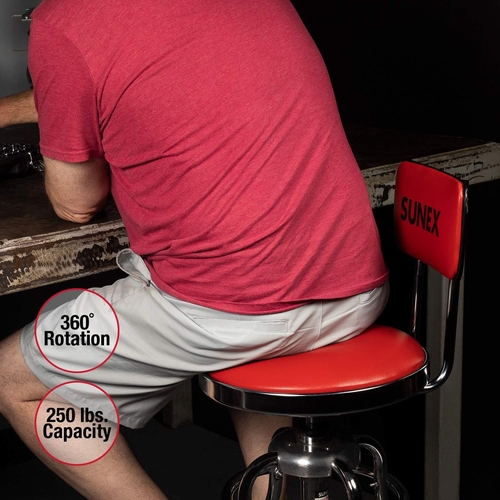 The Sunex Tools 8516 Hydraulic Shop Stool offers shop technicians a versatile, padded, and height-adjustable seating solution, built with a sturdy chrome frame and compact footprint while handling up to 250-pound loads.