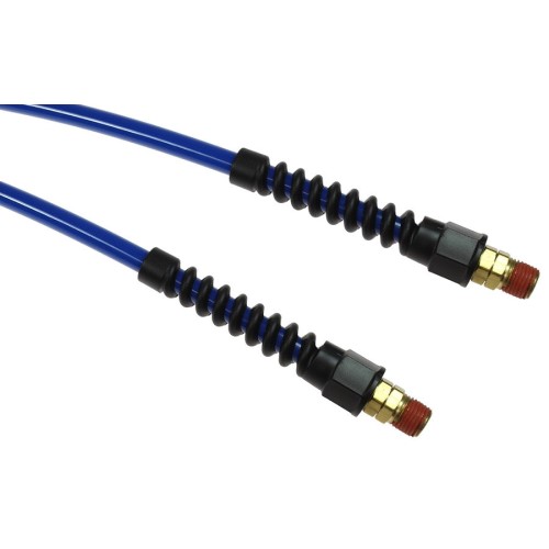 - Discover unparalleled durability and flexibility with the Coilhose Pneumatics PU14-30B-B Flexcoil Air Hose, 1/4" x 30', featuring high-quality brass fittings that ensure a robust connection. Crafted from lightweight yet sturdy polyurethane, this hose is designed for resilience in demanding environments. Its strain relief fittings are field repairable, guaranteeing extended product life and reducing downtime. Proudly made in the USA, it combines a retractable length of 43 inches with a working length of 27 feet, offering optimal maneuverability and ease of use. Ideal for various pneumatic applications, this hose, identified by its distinctive blue color and 1/4" NPT swivel fittings, stands as a reliable choice for professionals seeking superior performance and lasting quality.