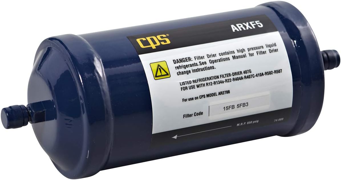 • The CPS Products ARXF5 41 cubic inch Replacement Filter Drier is a universal 41 cu.in. cartridge type filter drier that is made of high-quality materials.  It is used on recovery machines and works on a variety of recovery machines. The filter drier is easy to use and install.