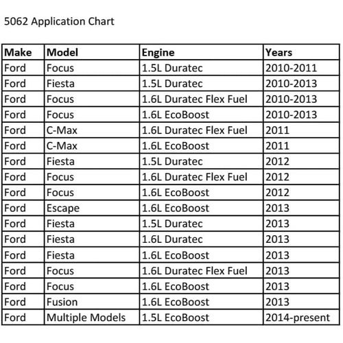 - Compatible with Ford 1.5L and 1.6L engines, including models such as Escape, Fiesta, Fusion, and Transit Connect