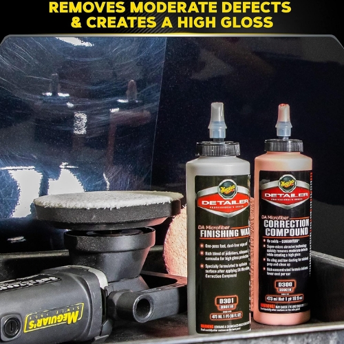 • This Meguiar’s DMCKIT5 DA Microfiber Correction System 5 inch Starter Kit is an all-in-one solution to remove moderate paint defects and apply protective finish, using dual-action technology to reduce swirls while restoring gloss.