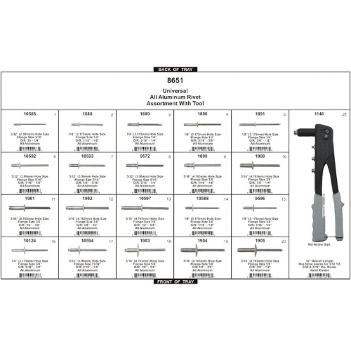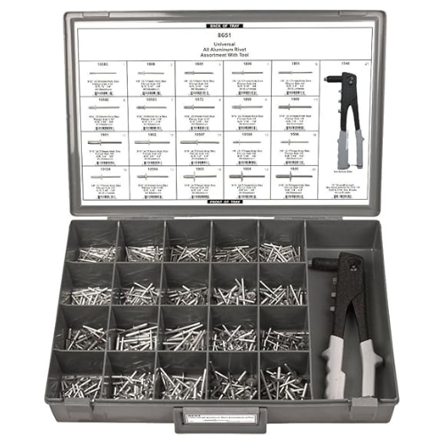 - This is the Disco 8651 aluminum pop rivet assortment kit, including 636 rivets in various sizes (3/32 inch to 3/16 inch) and a hand tool, packaged in a 21-hole gray plastic tray. It is used for general sheet metal fastening in automotive, bodywork, and repair applications.