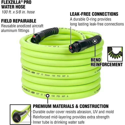 Flexzilla HFZWP5100 Pro Water Hose with Reusable Fittings, 5/8" inside diameter, 100' length, All Weather, Leak Free Connections