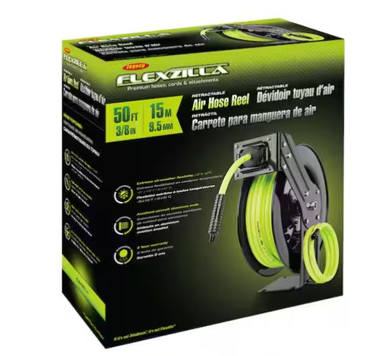 • Flexzilla L8611FZ is an open face retractable air hose reel that includes a 3/8 inch by 50 foot Flexzilla premium hybrid polymer air hose plus a 5 foot lead in hose. It keeps compressed air lines organized with an auto retract latch system, making it suited to indoor shop, mobile, and industrial air tool use.
