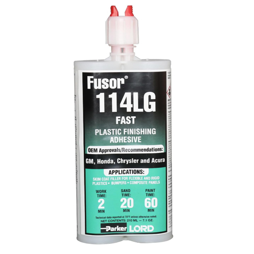 - The Fusor 114LG plastic finishing adhesive is a fast-cure two-component epoxy formulated for cosmetic repair of scratches, pinholes, and surface imperfections on plastic bumpers and body panels.