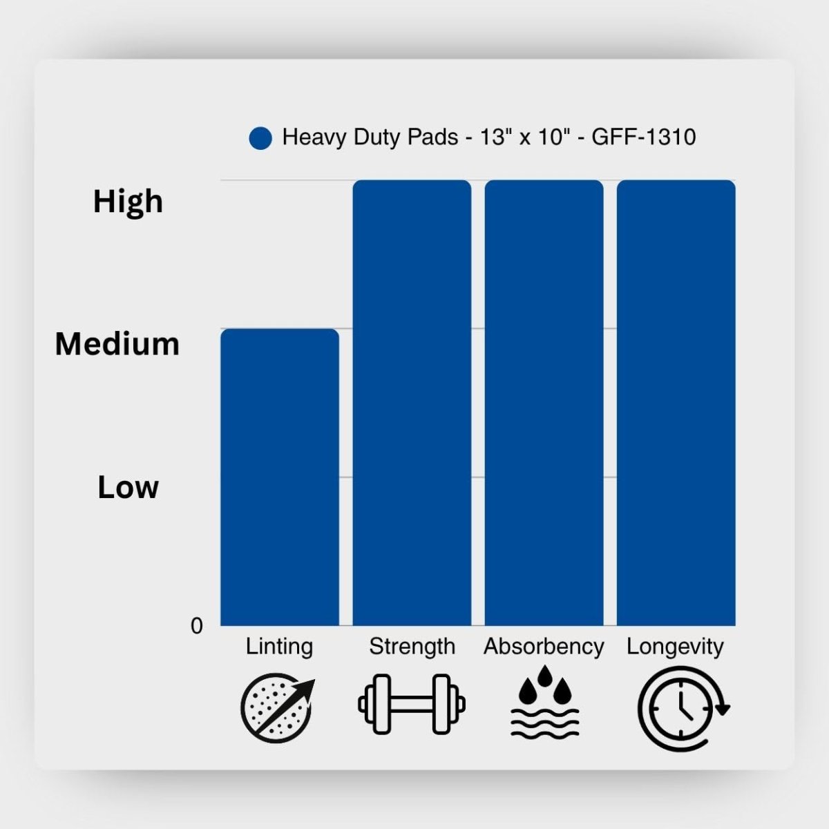 - The FyterTech Spilfyter GFF-1310 Universal Heavy Duty Absorbent Pads are heavy-duty 3-ply polypropylene sheets measuring 13 x 10 inches, packaged in a 100-count case. They are designed to absorb oils, water, coolants, solvents, and a wide range of industrial fluids, with a total capacity of up to 12 gallons per case.