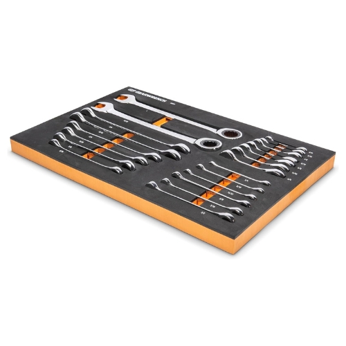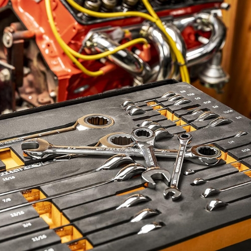 Gearwrench designs professional mechanics hand tools for automotive and industrial service, including 72 tooth ratcheting combination wrench sets organized in durable EVA foam trays for fast identification and access.