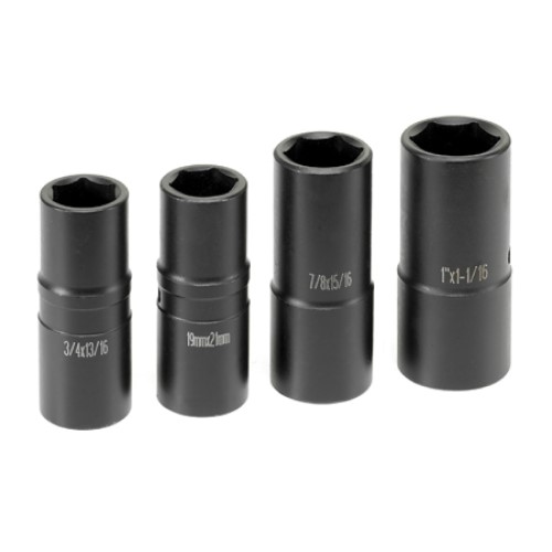 - A set of four (4) thin wall "flip" style impact sockets that have two different hex sizes in each socket. Sockets are designed for auto and light truck wheel fasteners.