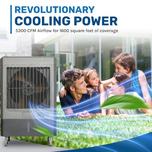 • The Hessaire MC61M is a portable evaporative cooler with a powerful 5,300 CFM airflow capacity, designed to cool areas up to 1,600 square feet. It includes a 14.6 gallon water reservoir, three-speed fan control, and can be operated using either manual fill or a continuous hose connection for extended runtime.