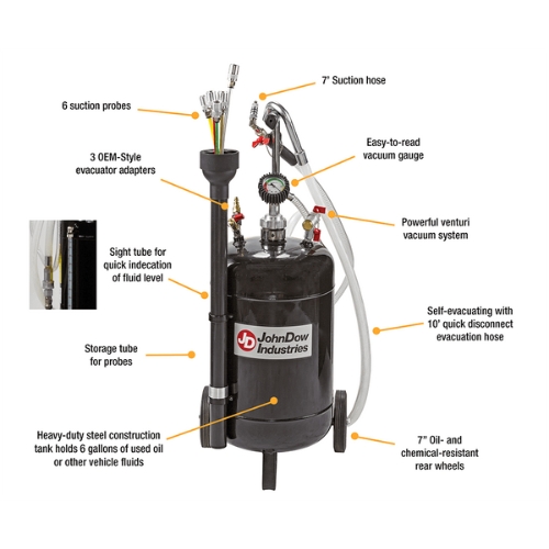 - The John Dow JDI-6EV Steel Fluid Evacuator is designed for removing used motor oil and other non-flammable fluids from vehicles when traditional drain pans are not practical. It features a venturi vacuum system powered by compressed air, a 7 foot suction hose, multiple suction probes and adapters, and a quick-disconnect evacuation hose for clean self-emptying.