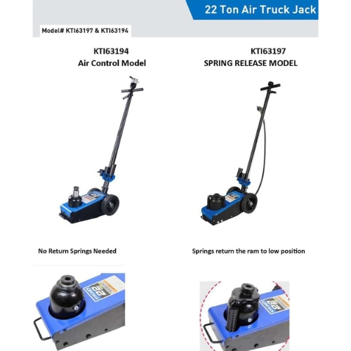- K-Tool International KTI63197 is a 22 ton air hydraulic truck jack designed for lifting heavy-duty vehicles at approved lift points. It uses shop air at 100 to 120 psi and delivers a low profile with a lift range from 8 2/3 to 13 1/2 inches for axle service.