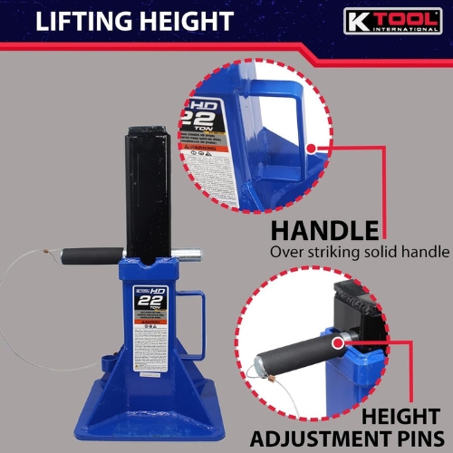 - K-Tool International HD61222 automotive jack stands are a heavy duty, pin style support pair for trucks and equipment. Adjustable from 11.875 to 19.75 inch, the stands use a V shaped saddle and a wide steel base for stable load holding. This is a support pair, not a replacement part.