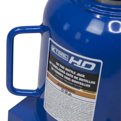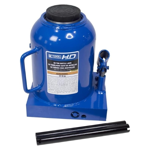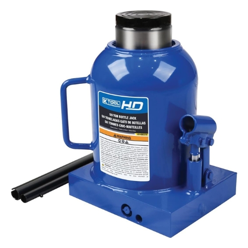 - K-Tool International HD63250 hydraulic bottle jack provides 50 ton lifting capacity for trucks and equipment. The verified lift range is 11.8 to 18.8 inch, and load limiting plus bypass valves help prevent overload and over travel. This is a standalone jack, not a replacement part.