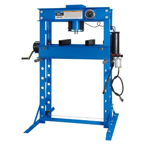 - K-Tool International HD63650 air hydraulic shop press delivers 50 ton pressing force for automotive and industrial tasks. It features a 7.5 inch ram stroke, a 6.6 to 34.2 inch working range, a double speed pump, and an anti-shock gauge. This is a standalone H-frame press, not a replacement part.