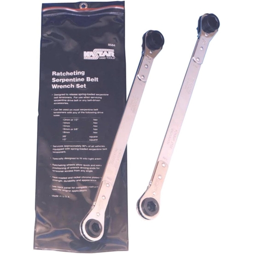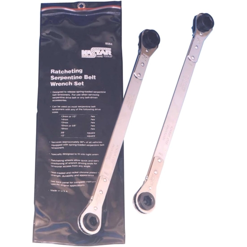 - The Lang 8584 Serpentine Belt Wrench Set is engineered to remove and install serpentine belts in tight engine compartments. Featuring a slim-profile ratcheting design and two different wrench sizes, it provides increased access and torque for hard-to-reach automotive applications. Ideal for professional mechanics and collision centers handling a variety of engine configurations.