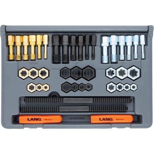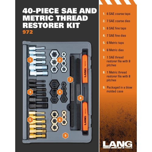 - The Lang 972 Thread Restorer Tap and Die Set is an essential tool for any mechanic or DIY enthusiast looking to repair or restore damaged threads. With 40 pieces covering both metric and SAE sizes, this set offers versatility and convenience for a wide range of applications. The high-quality construction ensures durability, making it ideal for both professional and personal use.