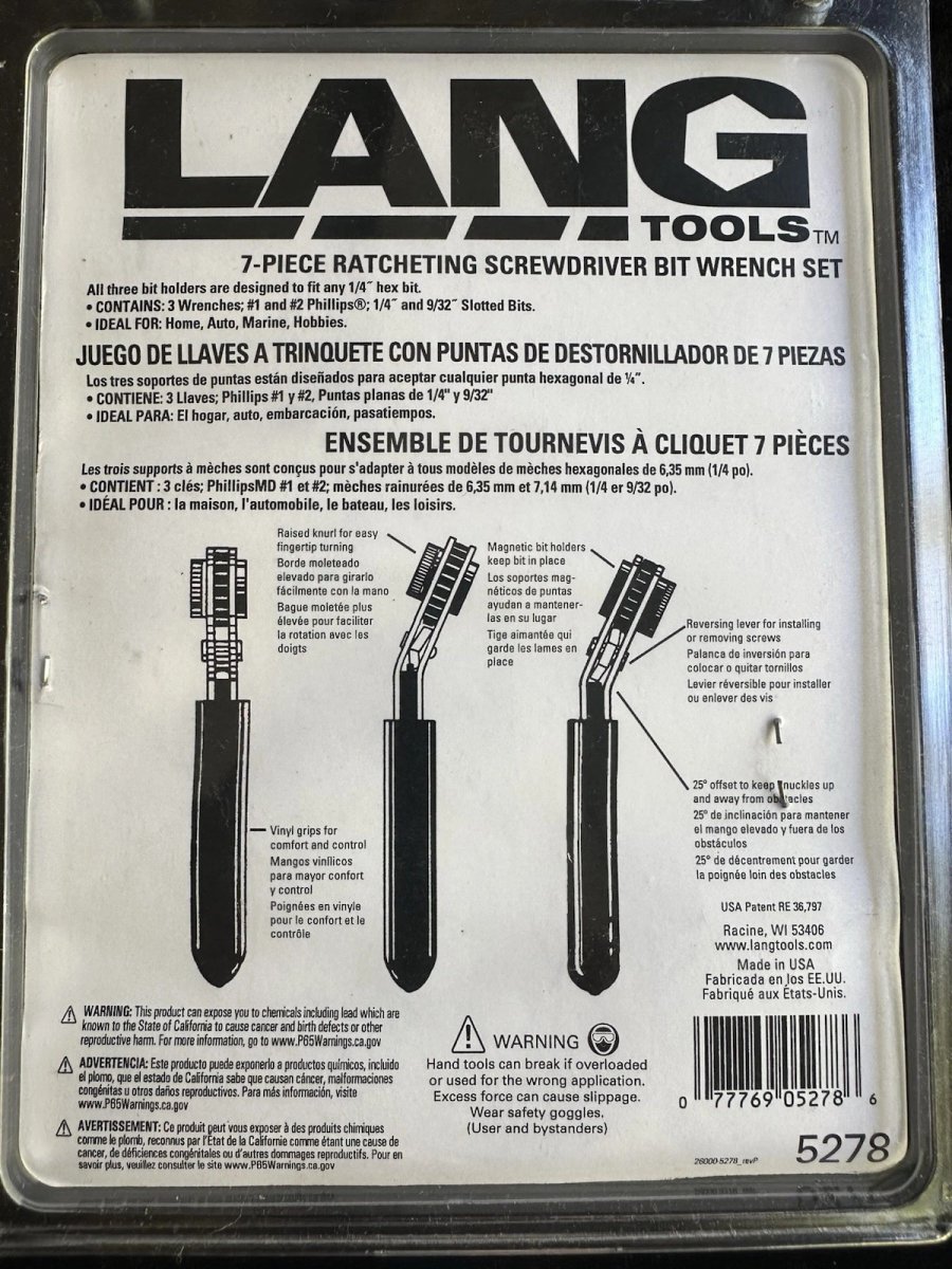 - The Lang Tools 5278 Ratcheting Screwdriver Bit Wrench Set is a 7-piece set that includes a 25° offset wrench, a 25° reverse offset wrench, a flat wrench, and four bits: #1 and #2 Phillips, and 1/4" and 9/32" slotted. The wrenches are made of durable steel and have a comfortable rubber grip. The bits are made of high-quality steel and are heat-treated for strength and durability. The set is perfect for a variety of applications, including automotive, home repair, and electronics.