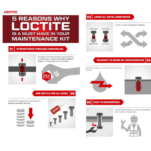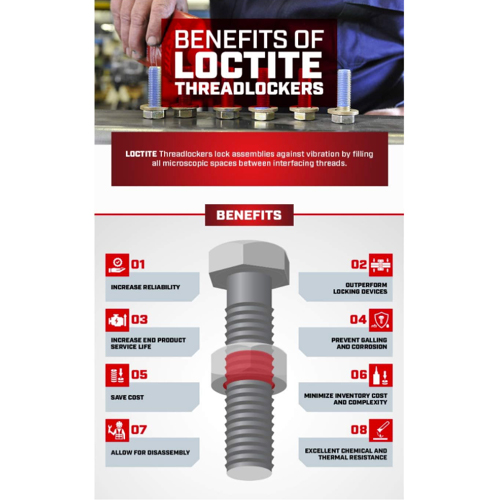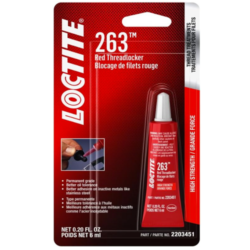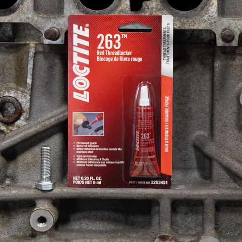 • The Loctite 263 High-Strength Red Threadlocker is a primerless, anaerobic adhesive formulated to permanently lock and seal threaded fasteners in automotive, industrial, and machinery applications. It prevents loosening and leakage caused by vibration, heat, and heavy mechanical loads.
