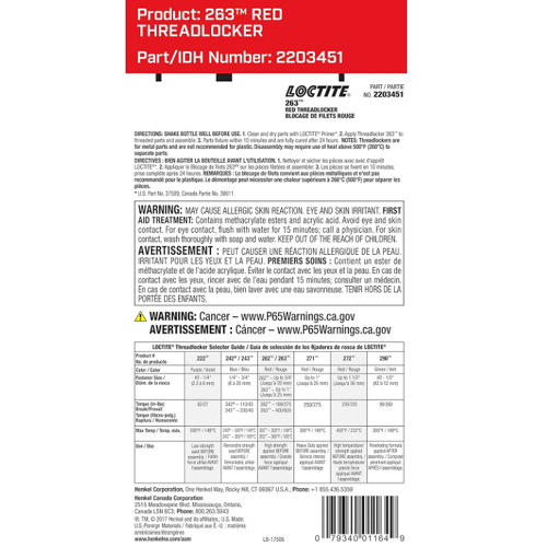 • Product Name: Loctite 263 High-Strength Red Threadlocker