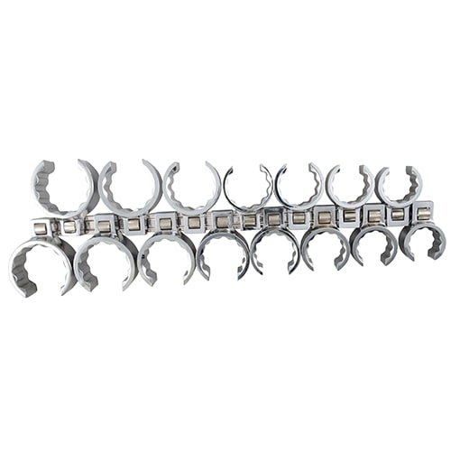 - This is a Martin chrome drive socket set that includes 13 crowfoot socket wrench attachments. They come on a clip rail for easy organization and storage. Crowfoot Socket Wrench Attachments are drop forged from steel bar. These wrenches are available in drive sizes of 3/8” and ½”, in 12 point Flare-Nut openings in fractional sizes. These are special purpose attachment heads designed to accept either a socket wrench handle or extension piece, for use in tightening or loosening nuts which are in odd positions. The 12 point Flare nut design provides extreme flexibility in addressing these situations. The extra head thickness provides maximum surface contact area and helps prevent marring of fittings.
