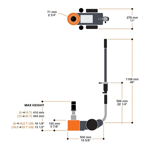 - 2-stage lifting: 33-ton cylinder up to 13 1/2'' and 16.5-ton cylinder up to 16 1/8'' (using the two extensions)
