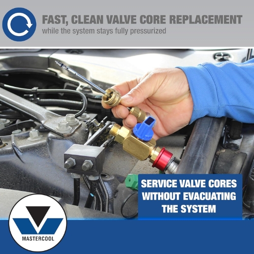 - The Mastercool 58490 Universal Kit lets technicians remove and install valve cores on R12 and R134a air conditioning systems while the system remains pressurized; it includes a built-in ball valve, multiple shaft types, and adapters to cover a wide range of valve core styles without discharging refrigerant.