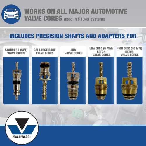 - The Mastercool 58490 can also be referred to as Mastercool universal core remover/installer 58490, Mastercool under-pressure R134a valve core service kit, Mastercool valve core change kit standard/JRA/Eaton cores, and Mastercool R12/R134a valve core service tool set