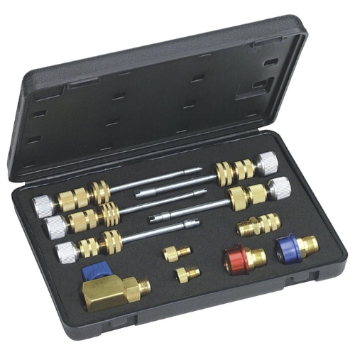 - Includes multiple connector types: 16 mm high-side R134a, 13 mm low-side R134a, 1/4 inch FL swivel connector; plus several shafts/assemblies for different valve core styles to adapt to many vehicle systems.
