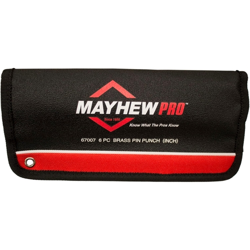 • The Mayhew 67007 Brass Pin Punch Set SAE is a six-piece kit of non-marring, non-sparking brass pin punches in imperial sizes, featuring knurled handles and an anti-slip pouch for secure storage and transport.