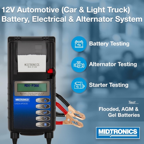 - Midtronics MDX-P300 battery and electrical system analyzer tests 12 volt automotive batteries and starting or charging systems. It uses conductance technology for quick results and prints findings for customers. This is a diagnostic tool for cars and light trucks; it is not a replacement part for another SKU.