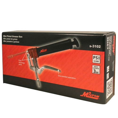 • The Milton S-3102 Mini Pistol Grease Gun delivers compact, one-handed lubrication with 3500 PSI capability and dual discharge ports-ideal for tight or awkward grease fitting access.