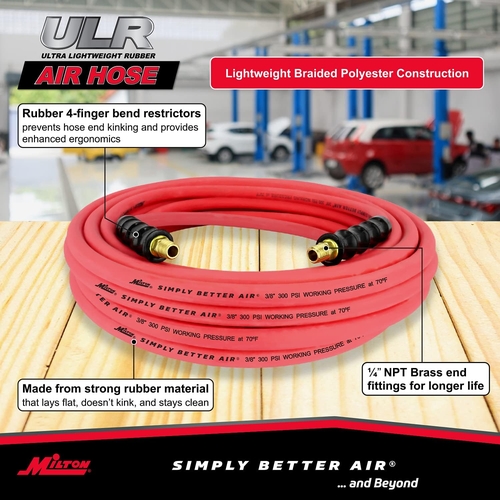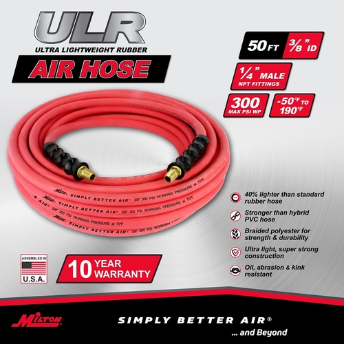 - The Milton ULR385014 Ultra Lightweight Rubber Air Hose delivers the durability of a rugged rubber hose with about 40 percent less weight-featuring a 3/8 inch inside diameter and 50 foot length with 1/4 inch NPT male threaded ends, built to resist abrasions, kinks, ozone, and extreme temperatures.