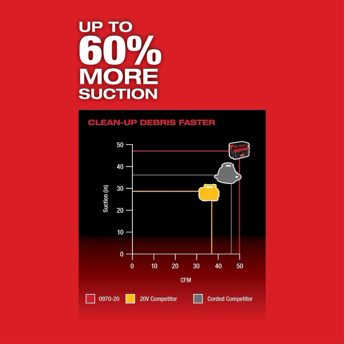 - Milwaukee 0970-20 is an M18 FUEL PACKOUT 2.5 gallon wet/dry vacuum engineered for mobile jobsite cleanup. A brushless motor and HEPA filtration deliver 50 CFM and 47 inch water lift at 87 dB for strong, quieter suction. This is a standalone tool only, not a replacement part.