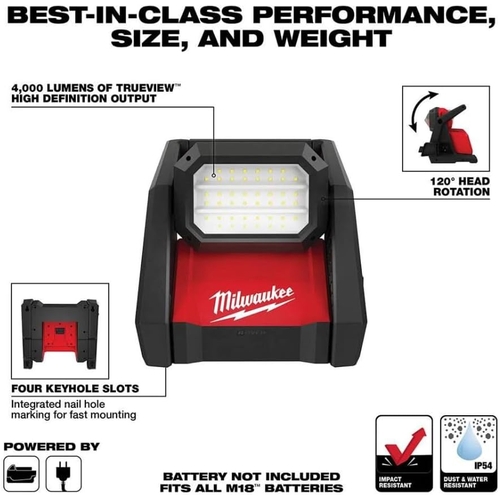 - System Compatibility or Application: Designed for use with Milwaukee M18 batteries; general jobsite flood lighting; not a replacement part