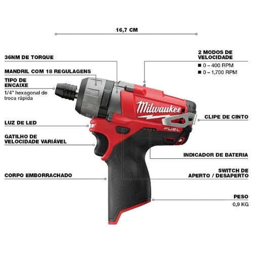 - Milwaukee 2402-20 is an M12 Fuel 2-speed screwdriver for precise driving in tight spaces. It delivers up to 325 in-lbs of torque with 0 to 450 and 0 to 1700 RPM ranges and a quick change 1/4 inch hex chuck. This is a standalone tool only, not a replacement part.