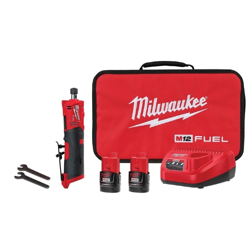 - Milwaukee 2486-22 is an M12 FUEL 1/4" straight die grinder kit for material removal and deburring in tight spaces. It delivers up to 20000 RPM with a 0.3 HP brushless motor and multi-mode RPM control for accessory matching. This is a complete kit, not a replacement part.