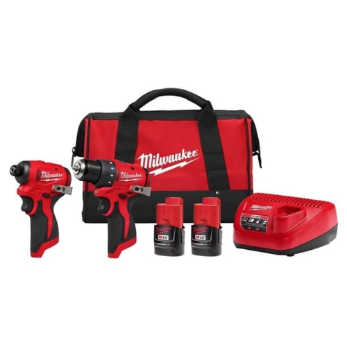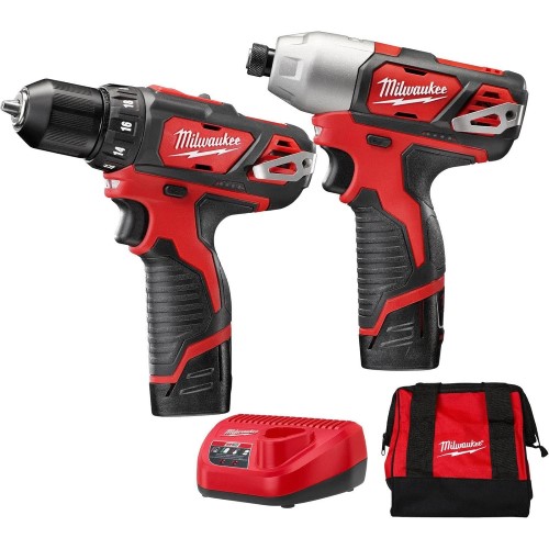 - Milwaukee 2494-22 is an M12 cordless 2-tool combo kit that pairs a compact 3/8 inch drill/driver with a 1/4 inch hex impact driver for drilling and fastening in tight spaces. The drill delivers up to 275 in-lbs of torque with 0 to 400 and 0 to 1,500 RPM ranges, and the kit includes two batteries and a charger.