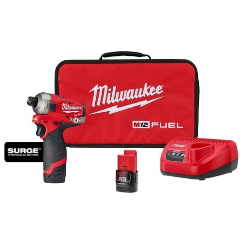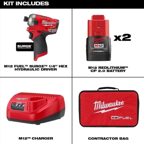 • The Milwaukee 2551-22 M12 Fuel Surge 1/4 inch hex hydraulic driver kit delivers quieter operation and sustained torque under load for efficient fastening in compact spaces; it comes with two 2.0Ah batteries, charger, belt clip, and contractor bag to ensure cordless convenience and extended runtime.