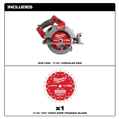 - The Milwaukee 2732-20 M18 Fuel 7-1/4 inch circular saw delivers corded-level cutting performance in a cordless format for professional carpentry, framing, and jobsite tasks; as a bare tool it operates on the M18 18V battery platform, with battery and charger not included.