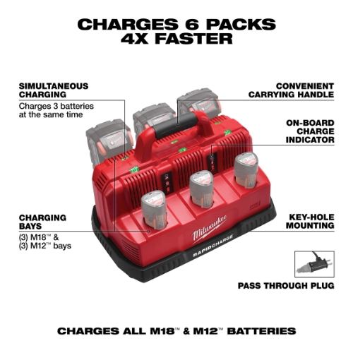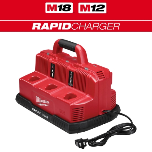 • The Milwaukee 48-59-1807 M12 & M18 Rapid Charge Station is a high-capacity charger designed for simultaneous charging of multiple battery packs. It supports both Milwaukee’s M12 (12 volt) and M18 (18 volt) Lithium-Ion battery systems, allowing up to six packs to be charged in less time than standard chargers while staying jobsite tough.