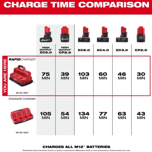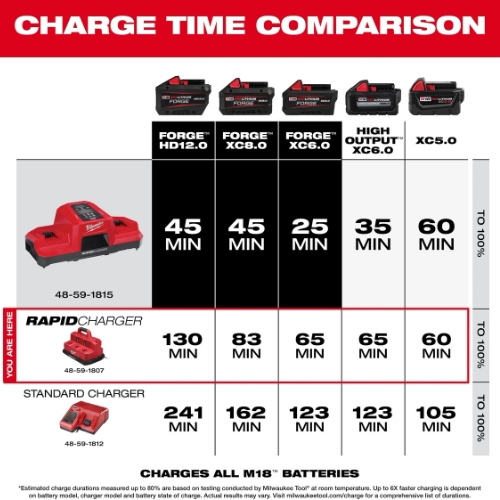 • Charges each battery up to 40 percent faster than Milwaukee’s standard chargers when used with compatible battery packs.