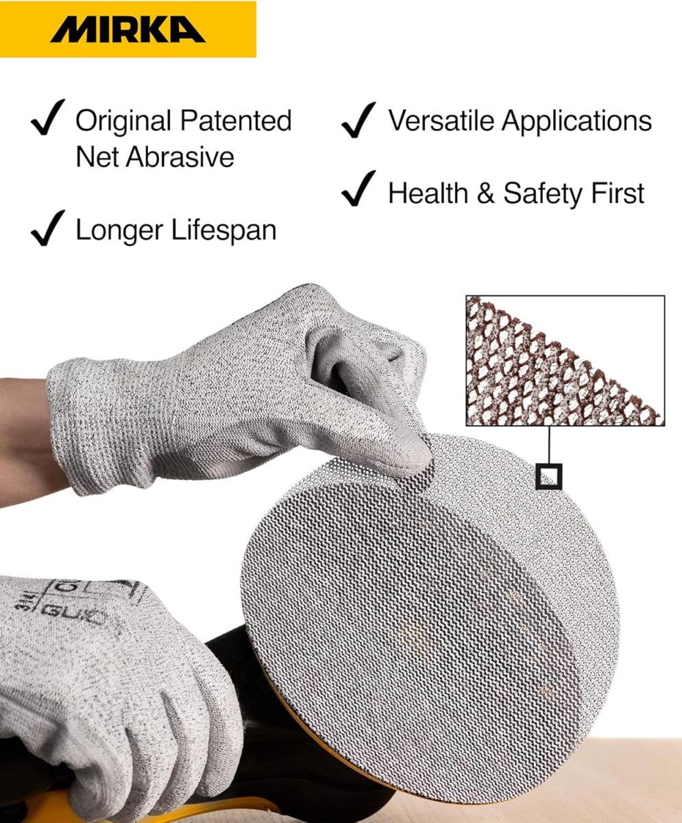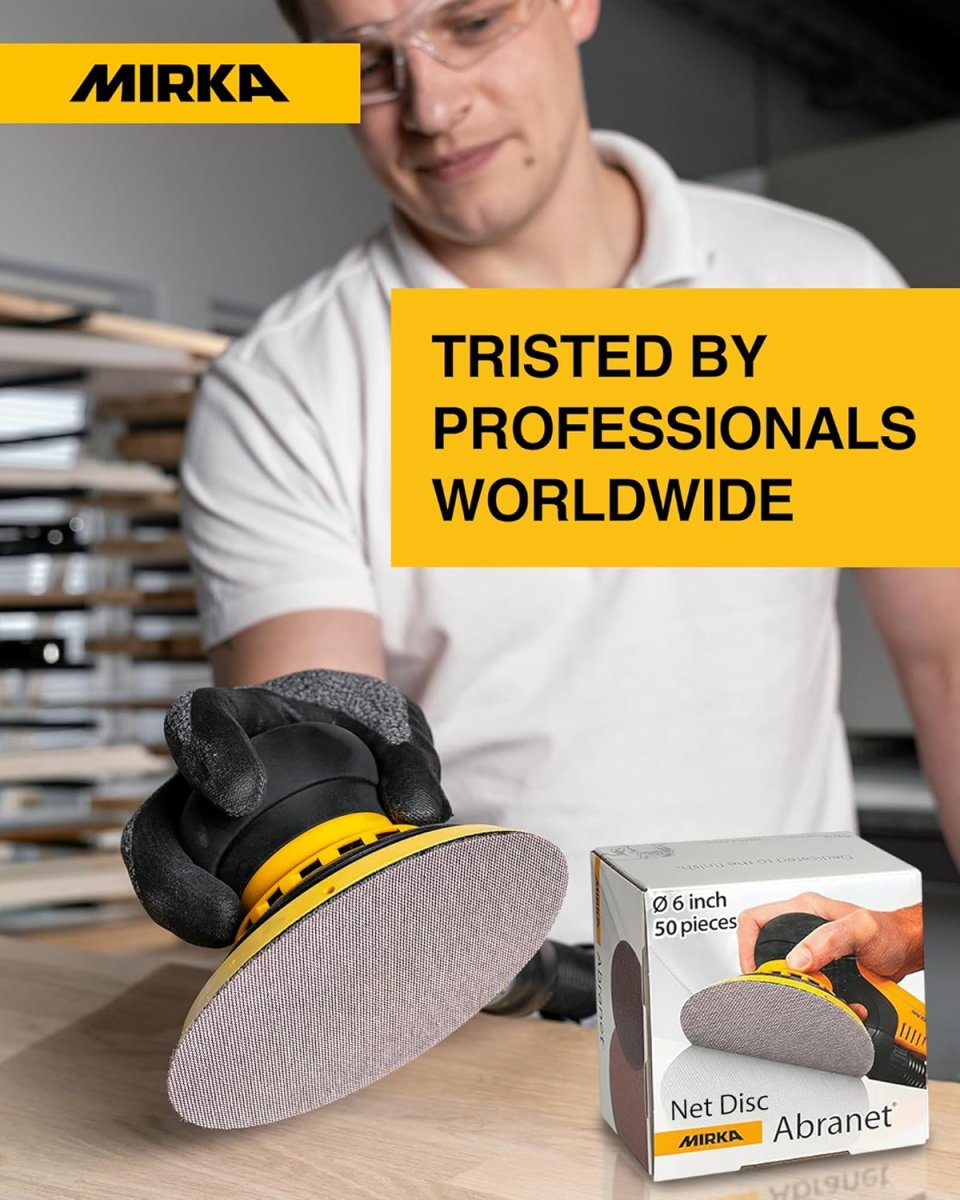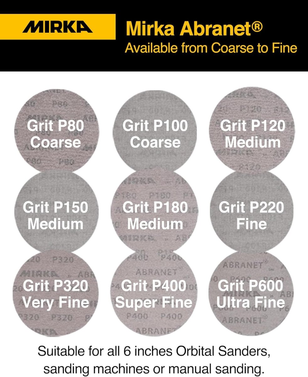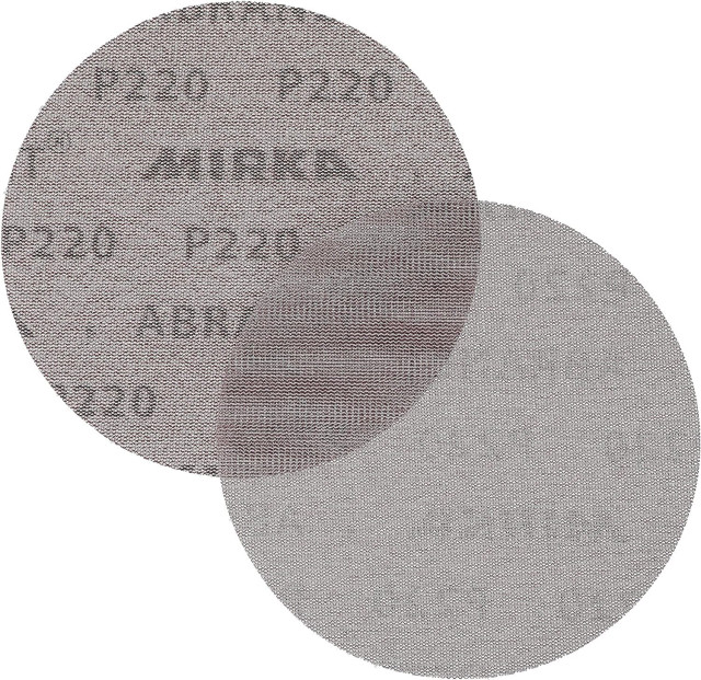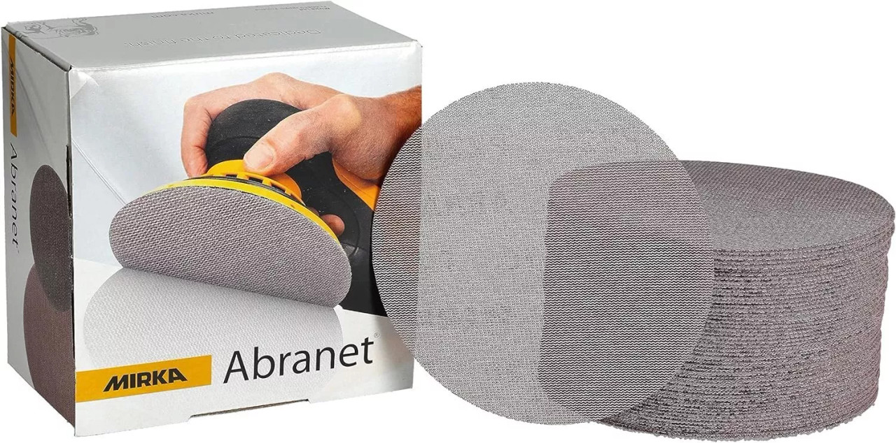- The Mirka 9A-241-180 Abranet Sanding Disc is a 6-inch diameter mesh sanding disc with 180 grit aluminum oxide, supplied in a pack of 50 discs. Its open-weave net backing allows dust evacuation for cleaner, longer-lasting sanding.