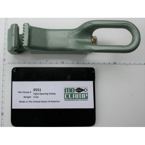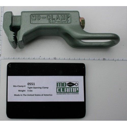 - The Mo-Clamp 0551 Original Tight Opening Clamp is expertly engineered to provide a reliable solution for accessing tight spaces in auto body repair. With a robust 3-ton capacity, this clamp is perfect for small pick-up frame rails and offers a strong grip with its 1½-inch wide and ½-inch deep surface. Made from heat-treated steel, it ensures durability and long-lasting performance in demanding environments.