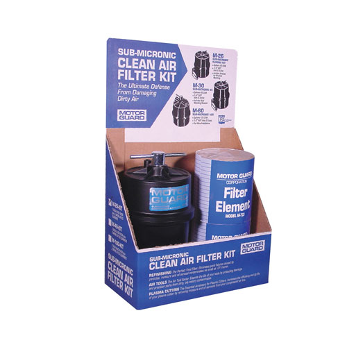- Motor Guard Sub-Micronic Compressed Air Filters are the ultimate defense against damaging, dirty air. Designed for installation at to the point of use, these filters remove particulates, condensed moisture and oil aerosols down to an incredible .01 microns in size. No other filter on the market provides this level of protection combined with a low pressure drop and ease of use. Produced from environmentally friendly recycled cellulose, the wound element in the Motor Guard filter traps contaminants and absorbs large quantities of moisture and oil. Features a mounting bracket and hardware for use with 1/4 inch hose. This unit will mount in spray booths, on plasma cutters or on other equipment requiring ultra-clean air and a flexible connection.