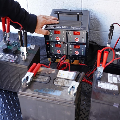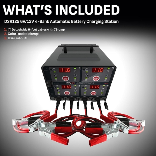 - The Schumacher DSR125 is a 4-bank automatic battery charger and maintainer that lets users charge up to four batteries at once. It supports both 6-volt and 12-volt battery systems in a durable, fan-cooled steel housing.