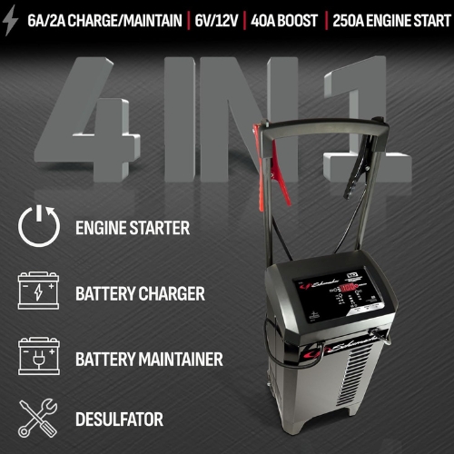 - The Schumacher SC1325 is a 4-in-1 wheeled battery charger, maintainer, engine starter, and desulfator built for 6-volt and 12-volt battery systems. It offers high output for engine cranking, plus intelligent charging and boost modes.