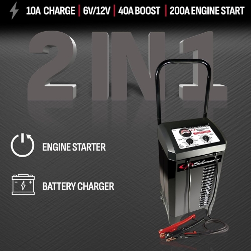 - The Schumacher SC1446 is a manual wheeled battery charger and engine starter that supports both 6V and 12V battery systems. It offers a 10A charge mode, multiple boost modes, and a 200A engine start capability, all in a cart-style design for workshop use.