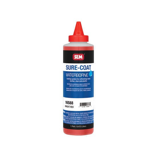- SEM Sure-Coat 16588 Waterborne Mixing System in Bright Red, available in a liquid form within a 1 Pint Can, is a top-notch solution for automotive interior refurbishment. Specifically designed for use on surfaces like leather, vinyl, and plastic, this waterborne coating system offers outstanding adhesion and coverage. Its vivid Bright Red hue brings a dynamic and eye-catching aesthetic to interior components. The 1 Pint Can provides ample quantity for moderate-sized projects, ensuring convenience for professionals and enthusiasts alike. As a waterborne system, it adheres to environmentally conscious practices, making it an excellent choice for those who prioritize sustainability. SEM Sure-Coat 16588 stands out for its durability, resistance to wear, and capacity to deliver a professional finish, making it a trusted option for enhancing and revitalizing automotive interiors.