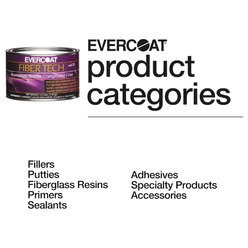 Evercoat supplies this Fiber Tech repair compound as a high-strength, waterproof polyester filler designed for structural repairs on metals or rigid substrates, curing quickly for efficient finishing and sanding in collision repair or industrial repair shops.